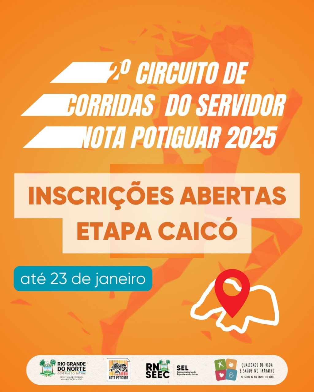 O Governo do Rio Grande do Norte, por meio da Secretaria de Estado da Administração (Sead), em consonância com o Programa de Qualidade de Vida e Saúde no Trabalho (PQVST), abriu inscrições para a etapa de Caicó do Circuito de Corridas do Servidor Nota Potiguar. O evento esportivo é realizado em parceria com a Subsecretaria de Esportes e Lazer, da Secretaria Estadual da Educação (SEL/SEEC), e com o Programa Nota Potiguar, da Secretaria de Estado da Fazenda (Sefaz). Tem também apoio da Diretoria Regional de Educação de Caicó (Direc-Caicó). Disponível tanto para os servidores do estado, quanto para a comunidade, as inscrições podem ser feitas através do link https://doity.com.br/circuito-caico até o dia 23 de janeiro, ou quando esgotarem as vagas.