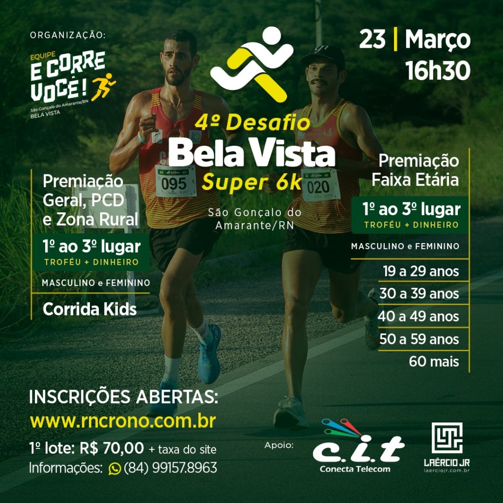 O 4º Desafio Bela Vista Super 6K já tem data marcada. O evento será realizado no dia 23 de março deste ano, às 16h30. A Escola Municipal Maria de Lourdes de Souza, em São Gonçalo do Amarante, sediará a concentração, largada e chegada.