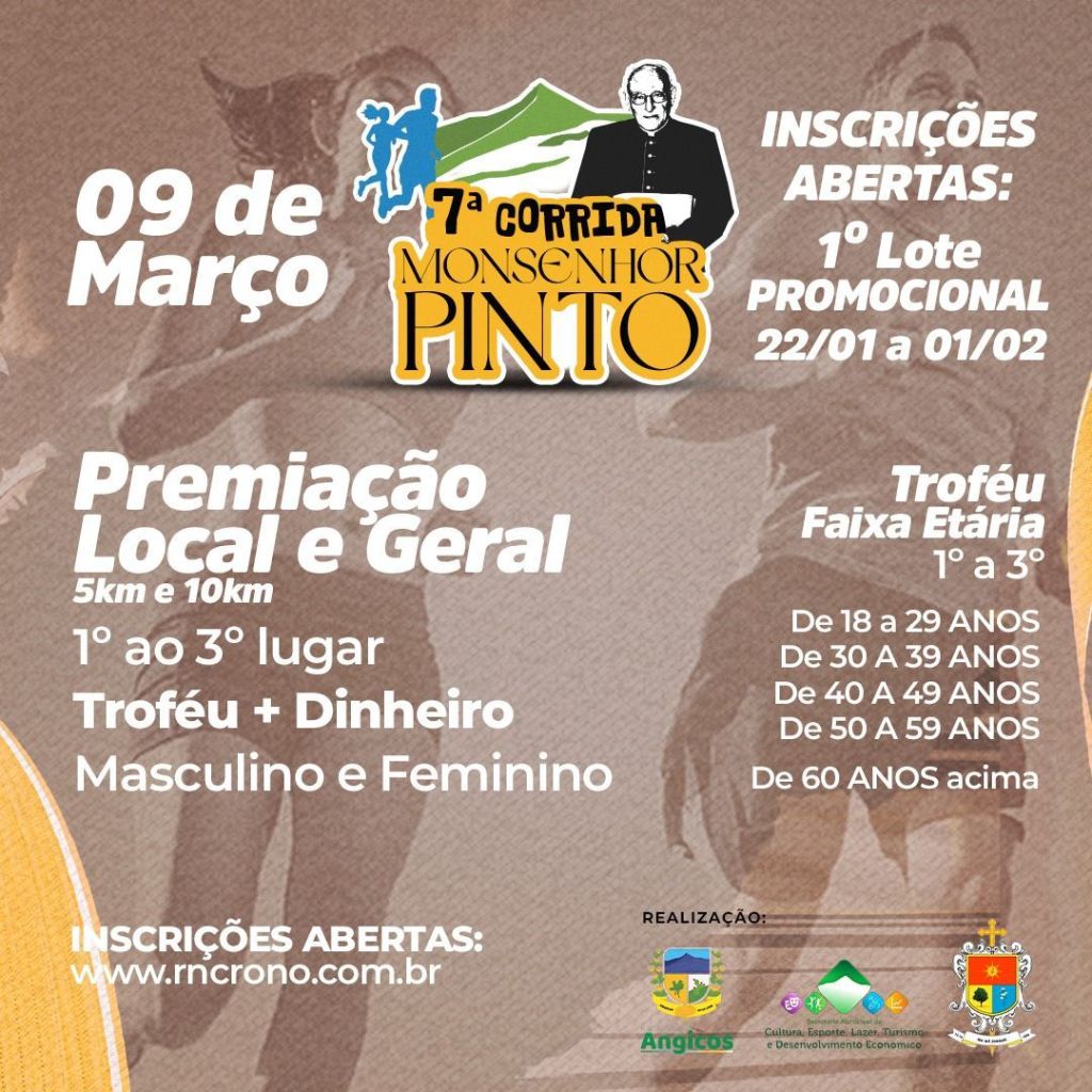 A largada da corrida está marcada para as 5h, em frente ao Clube Municipal, e se dará independentemente das condições climáticas, desde que não ofereçam riscos aos participantes. Os interessados em participar da prova têm até o dia 23 de fevereiro para se inscrever no link: https://www.rncrono.com.br/evento/562/7a-corrida-monsenhor-pinto.