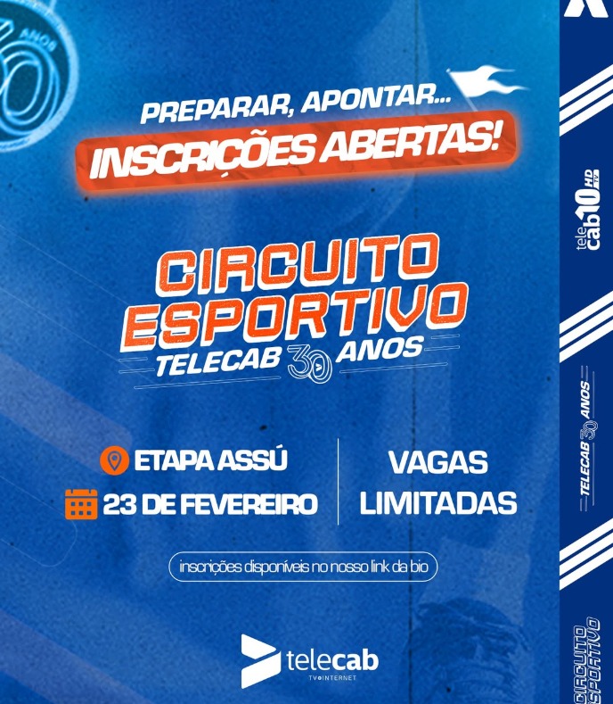 As inscrições para a Etapa Assú do Circuito Esportivo Telecab 30 Anos estão abertas. A prova, que será realizada no dia 23 de fevereiro, contará com duas modalidades: corrida de 5km e caminhada de 3km. A concentração dos atletas está prevista para as 5h30, com aquecimento às 5h50 e largada às 6h.