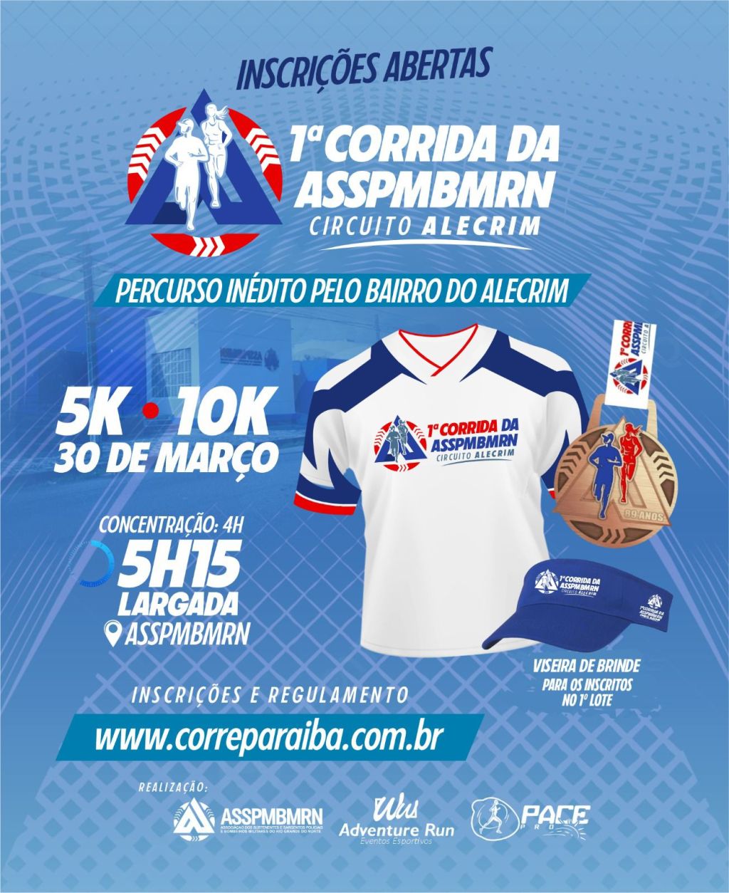 As inscrições para a 1ª Corrida da ASSPMBMRN Circuito Alecrim estão abertas. A prova, que será realizada no dia 30 de março deste ano, contará com duas distâncias: 5km e 10km. A concentração dos atletas está prevista para as 4h e a largada está marcada para as 5h15, em frente ao clube, localizado na Av. Presidente Bandeira, no bairro do Alecrim, em Natal.