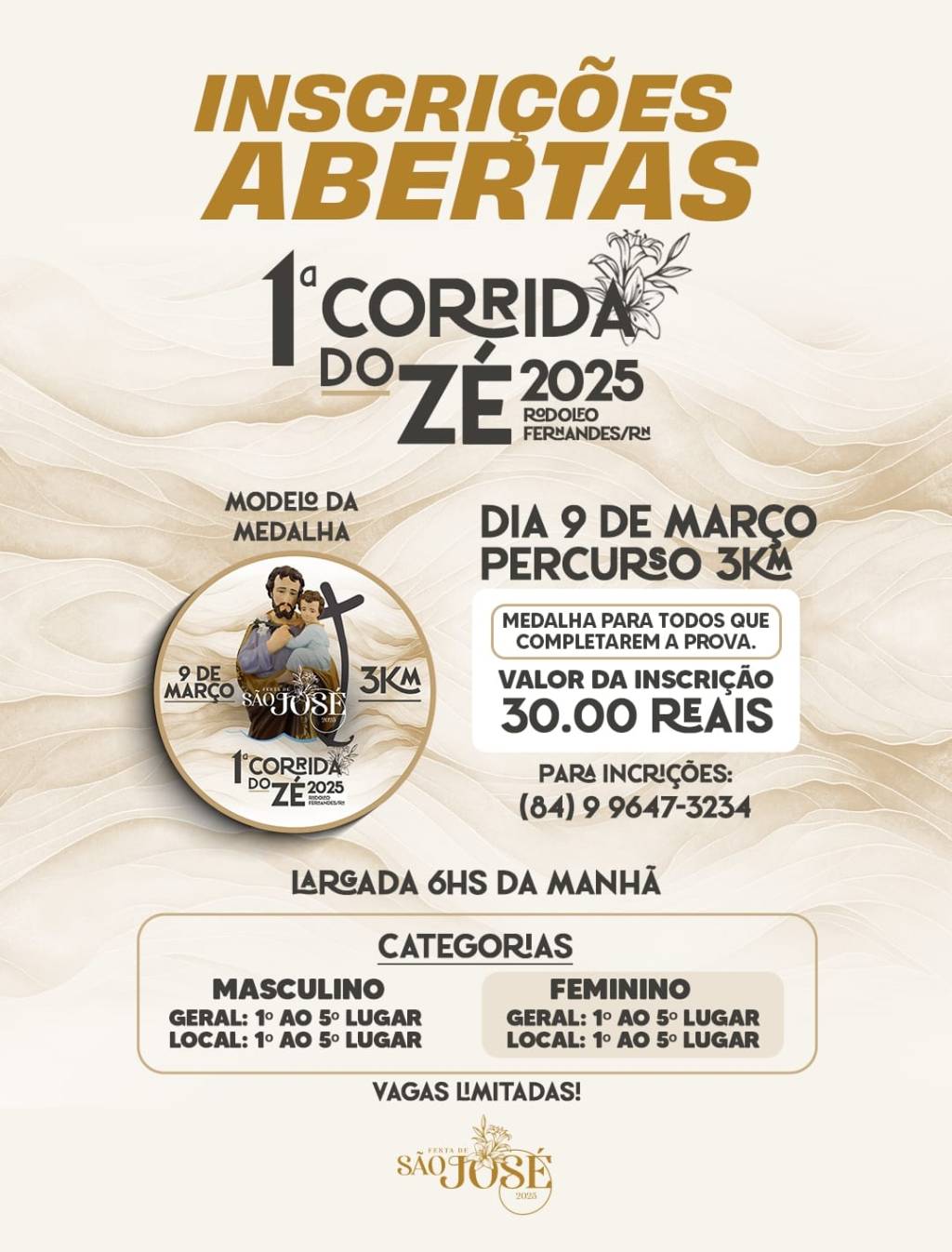 Os interessados em participar da 1ª Corrida do Zé devem se inscrever o mais rápido possível, pois o evento terá apenas 100 vagas disponíveis. Para mais informações, é possível entrar em contato com a organização do evento pelo WhatsApp no número (84) 99647-3234.