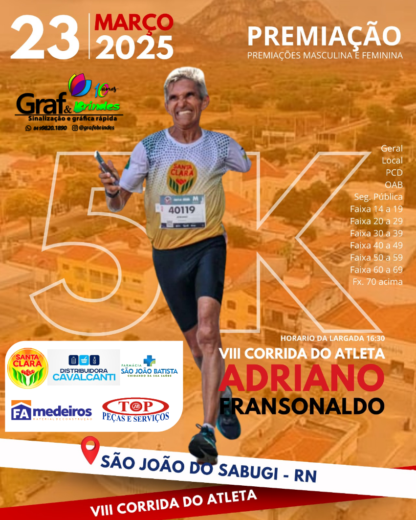 A corrida será realizada na RN-118, que Liga São João do Sabugi e Ipueira, com inscrições disponíveis no site (https://www.084sports.com.br/). O custo da inscrição é R$ 45 sem camisa, mais taxa do site, para a corrida de 5km.