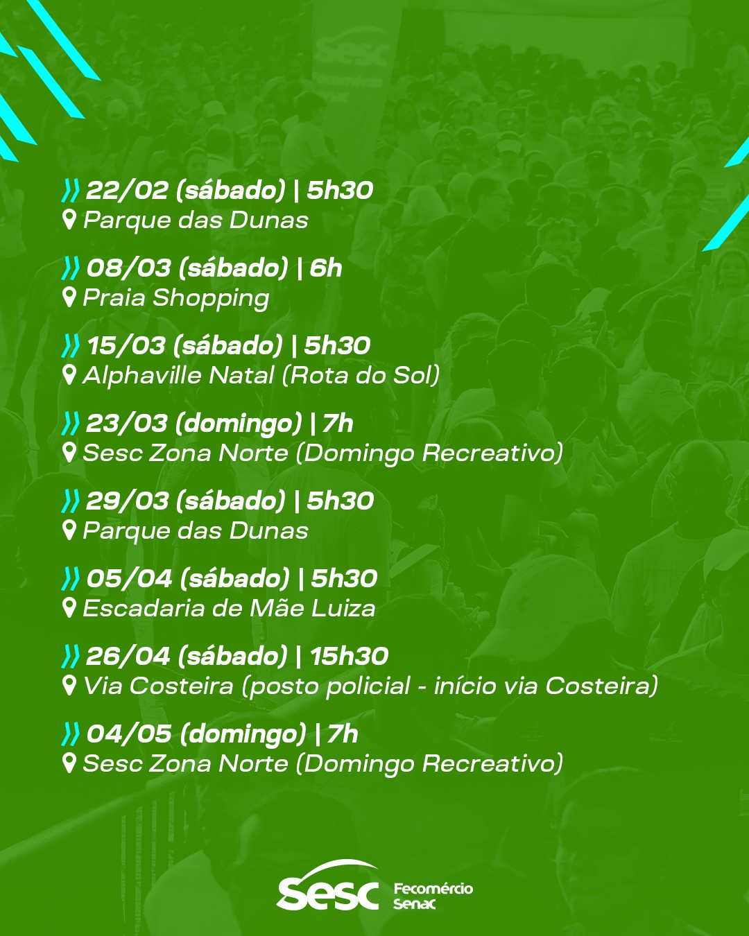 Em março, no dia 15, às 5h30, acontece mais um treino na Rota do Sol, próximo ao condomínio Alphaville e ao posto policial. No dia 23, às 7h, a prática é em frente ao Sesc Zona Norte, e no dia 29, às 5h30, no Parque das Dunas. Em abril, no dia 5, o treino será na Escadaria de Mãe Luiza e no dia 26, às 5h30, na Via Costeira. O último treino gratuito acontece no dia 4 de maio, no Sesc Zona Norte, às 7h.