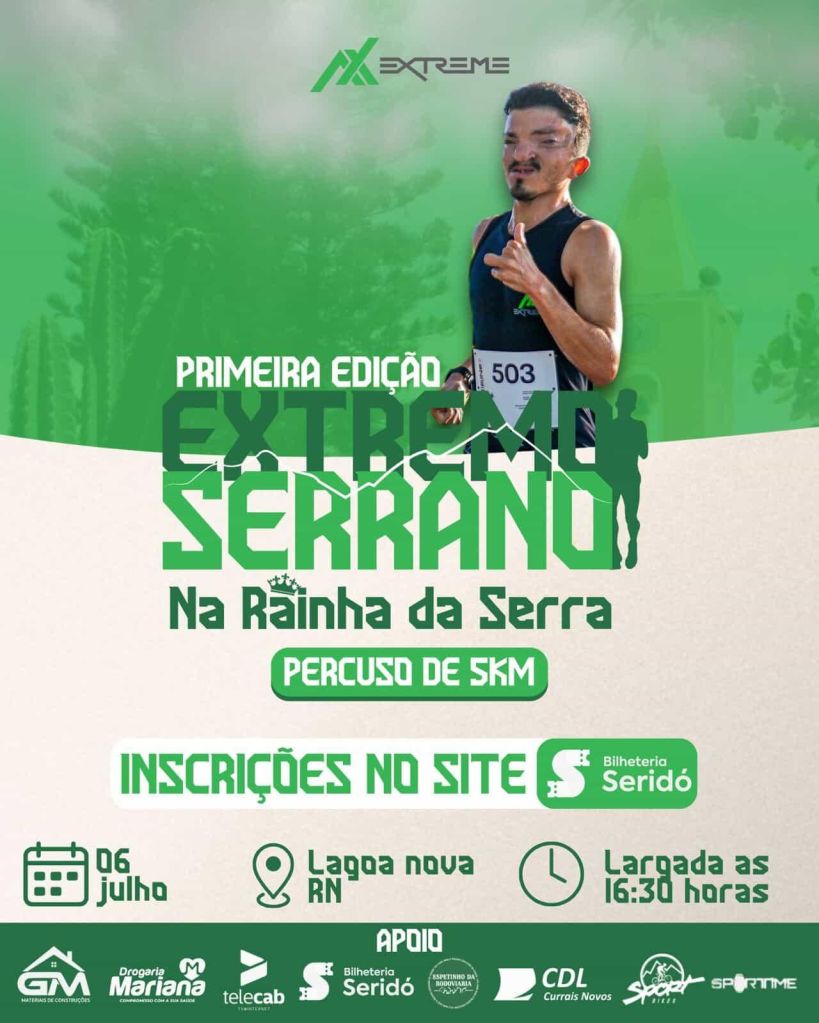 A Corrida Extremo Serrano será realizada em Lagoa Nova no próximo dia 6 de julho. A largada está programada para as 16h30. O evento tem como objetivo promover saúde, esporte e turismo de aventura na região serrana do Seridó potiguar. As inscrições para a corrida custam R$ 50 mais a taxa do site e são feitas exclusivamente pela plataforma Bilheteria Seridó. Há um limite de 200 vagas para atletas.