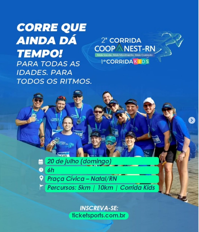 “A largada será às 6h da manhã para as provas de 5k e 10k, e às 8h para a Corrida Kids. Tudo está sendo preparado para que esta segunda edição seja um evento que envolva toda a família. O incentivo à prática esportiva é fundamental para promover hábitos saudáveis e melhorar a qualidade de vida da população”, afirma o diretor da Coopanest-RN, o médico anestesiologista Sérgio Lima.