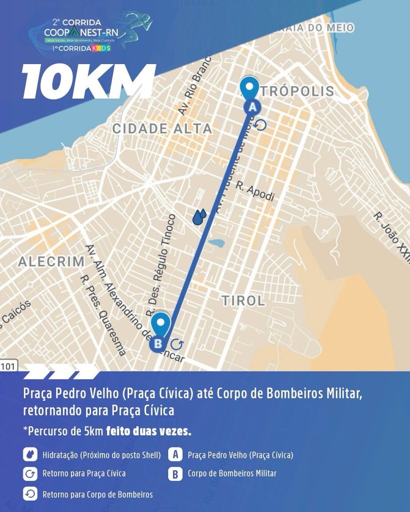 O trajeto principal será realizado na Avenida Prudente de Morais, entre a Praça Cívica e o Corpo de Bombeiros. Os participantes da categoria de 5k farão esse percurso em um único trecho de ida e volta. Já os inscritos nos 10k completarão o circuito duas vezes, totalizando a distância regulamentar. Pontos de hidratação estarão distribuídos ao longo do trajeto, visando o conforto e a segurança dos corredores.