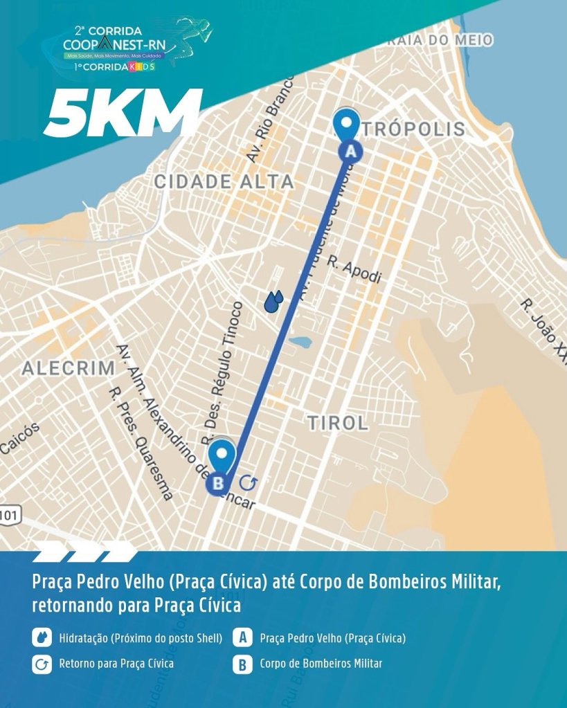A Cooperativa dos Médicos Anestesiologistas do Rio Grande do Norte (Coopanest-RN) divulgou os percursos oficiais da 2ª Corrida Coopanest-RN e da 1ª Corrida Kids, marcadas para o dia 20 de julho, em Natal. A largada e a chegada acontecem na Praça Pedro Velho (conhecida como Praça Cívica), no bairro de Petrópolis.